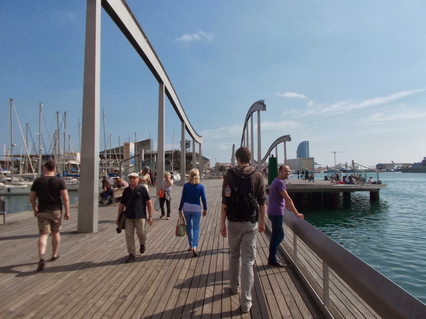 Im Hafen selber schließt sich die Rambla de Mar an, ein breiter Holzsteg mit einigen Straßenhändlern. Der Steg endet vor einer neu errichteten Shoppingmall. Wir finden eine freie Sitzbank und genießen den Blick auf das Meer und den warmen Sonnenschein. Am späten Nachmittag gehen wir vom Hafen wieder in die Altstadt zurück, nehmen aber diesmal den Weg über das Viertel El Raval.