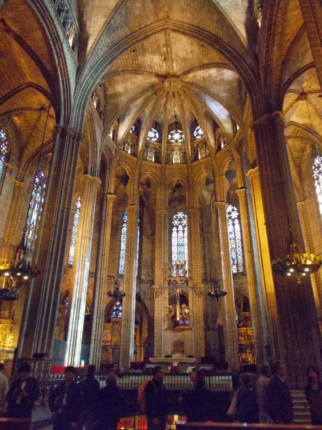 Weiter geht es an der berühmten Seufzerbrücke vorbei zur Catedral de la Santa Creu i Santa Eulàlia, der Kathedrale von Barcelona. Wie wir am Eingang sehen, gibt es am späten Nachmittag gesonderte Öffnungszeiten, zu denen man gegen eine kleine Gebühr das Innere besichtigen kann. Da der Eintritt zu den restlichen Zeiten umsonst ist, soll der Ansturm von Touristen am Nachmittag weit geringer sein. Es ist noch zu früh für diese Sonderöffnungszeiten, daher gehen wir zum ehemaligen Fischerviertel La Barceloneta weiter, das direkt am Meer liegt. Sowohl die engen Gassen des Viertels als auch der Blick auf die stürmische See haben ihren Reiz, leider hat jedoch keines der Strandcafés geöffnet und der stürmische Wind lädt nicht dazu ein länger zu verweilen. Also spazieren wir langsam wieder in die Altstadt zurück wo wir grade rechtzeitig die Kathedrale erreichen, um zu noch in den Genuss der Sonderöffnungszeiten zu kommen. Die Kirche ähnelt in ihrer Architektur stark der Kirche Santa Maria del Mar, die Innenausstattung ist jedoch wesentlich reicher.