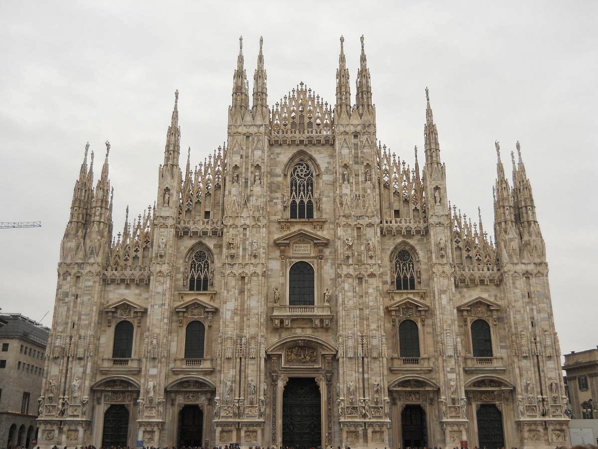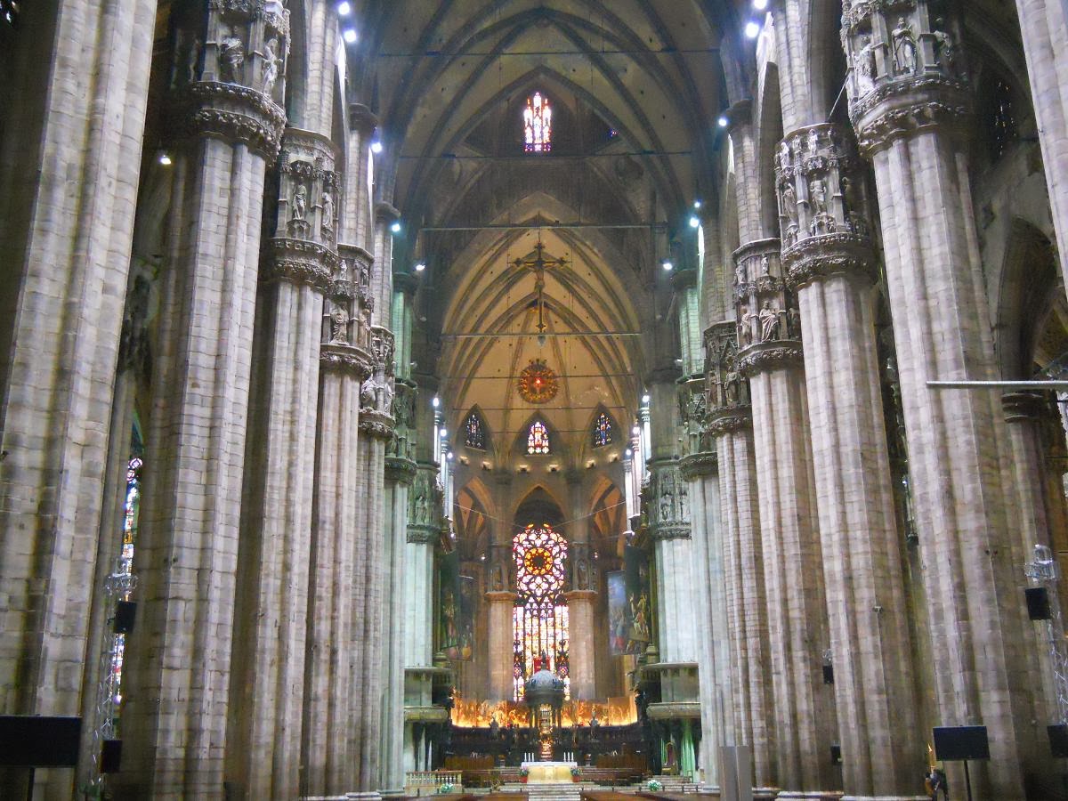 Vom Friedhof gehen wir weiter in Richtung des berühmten Mailänder Doms. Dabei passieren wir das so genannte golden Viereck (Quadrilatero d'Oro), in dem sich Modeboutiquen aller namhaften Designer befinden. Durch die überdachte Galleria Vittorio Emanuele II gelangen wir zu dem Platz vor dem Mailänder Dom. Nachdem wir die filigrane Fassade des Doms eine Zeitlang bestaunt haben, reihen wir uns in die Schlange vor dem Eingang ein. Der Mailänder Dom ist die drittgrößte Kathedrale der Welt und bietet in seinem Inneren Platz für 40.000 Menschen. Entsprechend herausragend ist die schiere Größe des Innenraums. Auch die riesigen, kunstvoll gestalteten Fenster hinterlassen Eindruck. Wir besuchen noch die ebenfalls frei zugängliche Krypta, dann verlassen wir den Dom wieder. Den restlichen Nachmittag spazieren wir durch das Kanalviertel und die gemütlichen Einkaufstraßen der Altstadt.