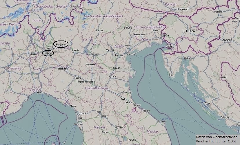 Am 1.11.2013 steigen wir also am frühen Abend am Flughafen Düsseldorf-Weeze in den Flieger nach Bergamo. Die für ihren historischen Stadtkern berühmte Provinzhauptstadt ist knapp 60 Kilometer von Milano entfernt und wird ausschließlich von Billigfluglinien angeflogen.