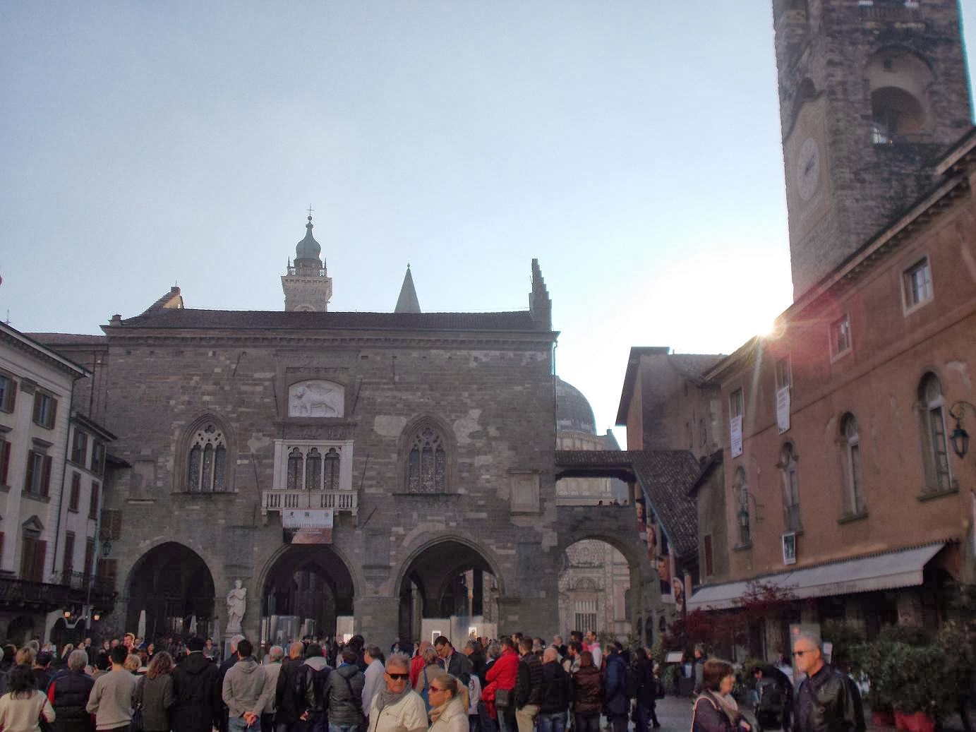 Am nächsten Tag schlafen wir lange und lassen uns das Frühstück schmecken, bevor wir in die Altstadt von Bergamo aufbrechen. Die Stadt gliedert sich in die historische Città Alta, die Oberstadt und die jüngere Città Bassa zu Fuße des Altstadthügels. Da die meisten Geschäfte in der Unterstadt um diese Zeit noch geschlossen sind, gehen wir zunächst in die Oberstadt hoch. Hinter dem Festungstor mit venezianischen Insignien erwarten uns schmale Gassen gesäumt von hohen Stadthäusern. Wir schlendern gemütlich durch die Sträßchen und finden uns schließlich auf dem Marktplatz wieder.